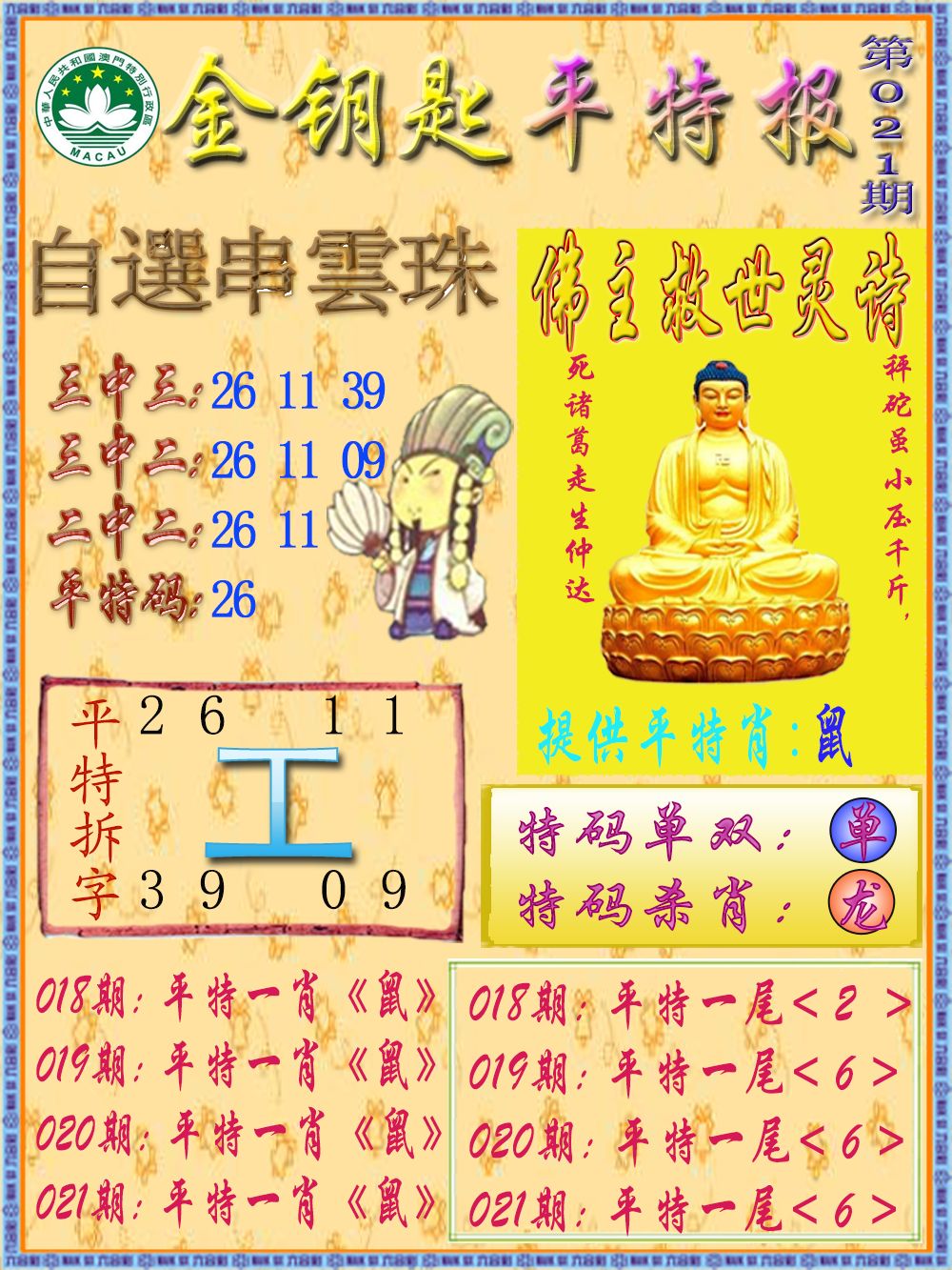 | 021期 | 鼠 | 6尾 | 红单 | 39-48 | 00? |